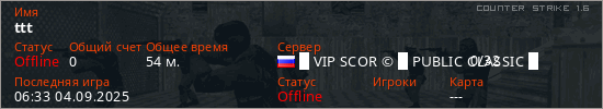 Играет на Counter Strike 1.6 сервере. Страна: РоссияПервый раз замечен 05:41 01.09.2025