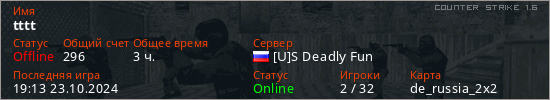 Играет на Counter Strike 1.6 сервере. Страна: РоссияПервый раз замечен 18:43 23.10.2021