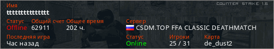 Играет на Counter Strike 1.6 сервере. Страна: РоссияПервый раз замечен 10:52 16.11.2019