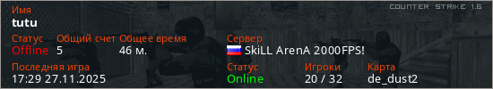 Играет на Counter Strike 1.6 сервере. Страна: РоссияПервый раз замечен 19:12 13.10.2025