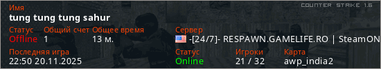 Играет на Counter Strike 1.6 сервере. Страна: СШАПервый раз замечен 00:24 11.05.2025