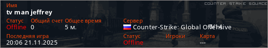 Играет на Counter Strike Source сервере. Страна: РоссияПервый раз замечен 20:02 21.11.2025