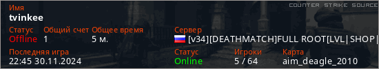 Играет на Counter Strike Source сервере. Страна: РоссияПервый раз замечен 22:43 30.11.2024