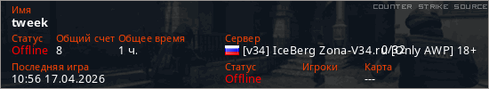 Играет на Counter Strike Source сервере. Страна: РоссияПервый раз замечен 16:24 08.04.2026