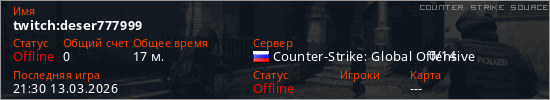 Играет на Counter Strike Source сервере. Страна: РоссияПервый раз замечен 20:48 10.03.2026