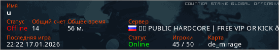 Играет на Counter Strike Global Offensive сервере. Страна: РоссияПервый раз замечен 16:43 02.05.2025