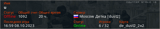 Играет на Counter Strike 1.6 сервере. Страна: РоссияПервый раз замечен 19:56 07.10.2020