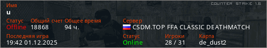 Играет на Counter Strike 1.6 сервере. Страна: РоссияПервый раз замечен 10:37 21.11.2019