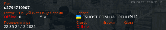 Играет на Counter Strike 1.6 сервере. Страна: УкраинаПервый раз замечен 22:24 24.12.2025
