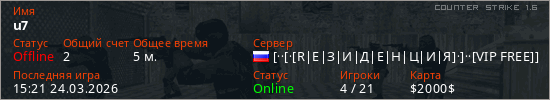 Играет на Counter Strike 1.6 сервере. Страна: РоссияПервый раз замечен 15:00 24.03.2026