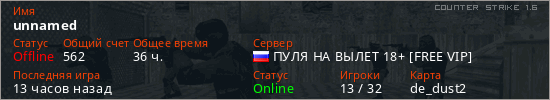 Играет на Counter Strike 1.6 сервере. Страна: РоссияПервый раз замечен 13:39 29.06.2025