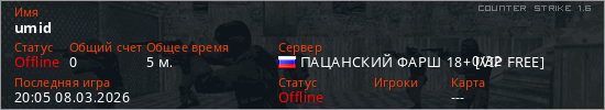 Играет на Counter Strike 1.6 сервере. Страна: РоссияПервый раз замечен 19:59 08.03.2026