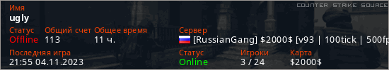 Играет на Counter Strike Source сервере. Страна: РоссияПервый раз замечен 19:24 30.03.2023