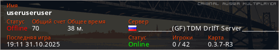 Играет на Criminal Russia Multiplayer сервере. Страна: РоссияПервый раз замечен 17:14 31.10.2025
