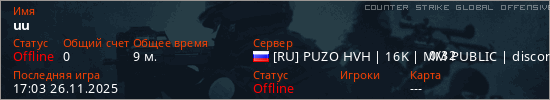 Играет на Counter Strike Global Offensive сервере. Страна: РоссияПервый раз замечен 11:40 04.05.2025