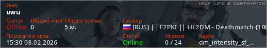 Играет на Half Life 2 DeathMatch сервере. Страна: РоссияПервый раз замечен 15:28 08.02.2026