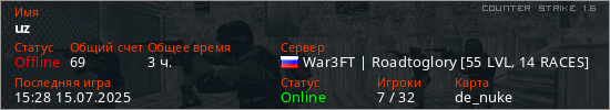 Играет на Counter Strike 1.6 сервере. Страна: РоссияПервый раз замечен 19:55 07.01.2022