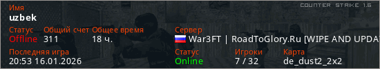 Играет на Counter Strike 1.6 сервере. Страна: РоссияПервый раз замечен 13:20 10.01.2021