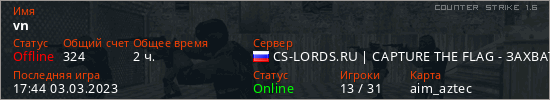Играет на Counter Strike 1.6 сервере. Страна: РоссияПервый раз замечен 02:22 07.02.2023
