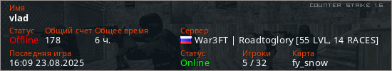 Играет на Counter Strike 1.6 сервере. Страна: РоссияПервый раз замечен 19:51 17.09.2021
