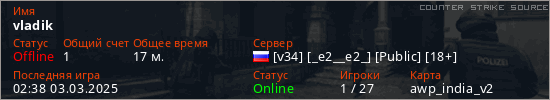 Играет на Counter Strike Source сервере. Страна: РоссияПервый раз замечен 09:51 27.09.2024