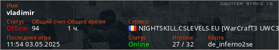 Последний раз был в сети 11:54 03.05.2025 Игрок с таким ником замечен на 25 серверах