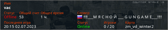 Играет на Counter Strike 1.6 сервере. Страна: РоссияПервый раз замечен 19:15 02.07.2023