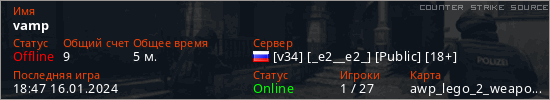 Играет на Counter Strike Source сервере. Страна: РоссияПервый раз замечен 18:26 16.01.2024