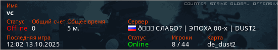 Играет на Counter Strike Global Offensive сервере. Страна: РоссияПервый раз замечен 12:00 13.10.2025