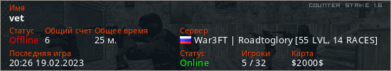 Играет на Counter Strike 1.6 сервере. Страна: РоссияПервый раз замечен 20:03 19.02.2023