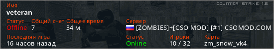 Играет на Counter Strike 1.6 сервере. Страна: РоссияПервый раз замечен 06:15 02.03.2026