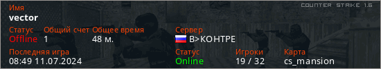 Играет на Counter Strike 1.6 сервере. Страна: РоссияПервый раз замечен 18:13 12.09.2020
