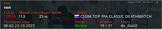 Играет на Counter Strike 1.6 сервере. Страна: РоссияПервый раз замечен 06:15 14.01.2022