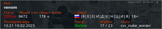Играет на Counter Strike 1.6 сервере. Страна: РоссияПервый раз замечен 13:06 07.11.2021