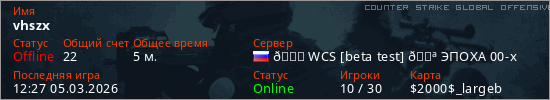 Играет на Counter Strike Global Offensive сервере. Страна: РоссияПервый раз замечен 12:21 05.03.2026