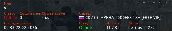 Играет на Counter Strike 1.6 сервере. Страна: РоссияПервый раз замечен 09:29 22.02.2026