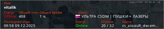 Играет на Counter Strike 1.6 сервере. Страна: РоссияПервый раз замечен 16:24 21.02.2024