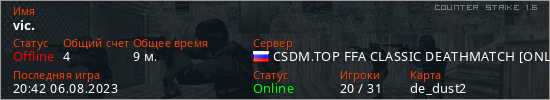 Играет на Counter Strike 1.6 сервере. Страна: РоссияПервый раз замечен 10:52 05.08.2023