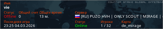 Играет на Counter Strike Global Offensive сервере. Страна: РоссияПервый раз замечен 21:00 04.03.2026
