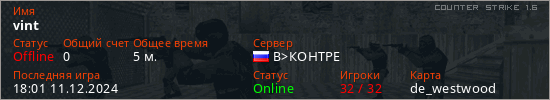 Играет на Counter Strike 1.6 сервере. Страна: РоссияПервый раз замечен 17:59 11.12.2024