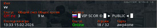 Играет на Counter Strike 1.6 сервере. Страна: РоссияПервый раз замечен 12:15 15.02.2026