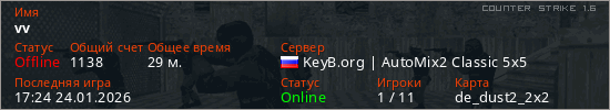 Играет на Counter Strike 1.6 сервере. Страна: РоссияПервый раз замечен 19:18 23.01.2026