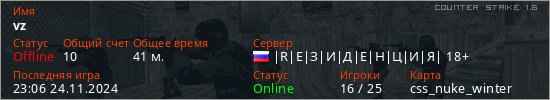 Играет на Counter Strike 1.6 сервере. Страна: РоссияПервый раз замечен 14:55 03.10.2024