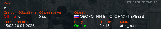 Играет на Counter Strike 1.6 сервере. Страна: РоссияПервый раз замечен 15:04 28.01.2026