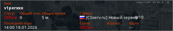 Играет на Counter Strike 1.6 сервере. Страна: РоссияПервый раз замечен 13:58 18.01.2026