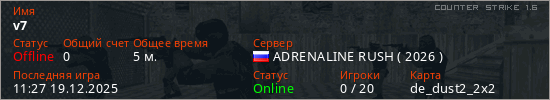 Играет на Counter Strike 1.6 сервере. Страна: РоссияПервый раз замечен 11:24 19.12.2025