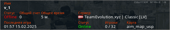 Играет на Counter Strike 1.6 сервере. Страна: ЛатвияПервый раз замечен 01:53 15.02.2025