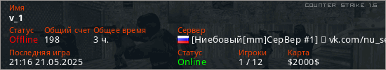 Последний раз был в сети 21:16 21.05.2025 Игрок с таким ником замечен на 31 сервере