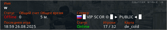 Играет на Counter Strike 1.6 сервере. Страна: РоссияПервый раз замечен 18:51 26.08.2025