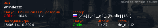 Играет на Counter Strike Source сервере. Страна: РоссияПервый раз замечен 17:51 11.10.2024